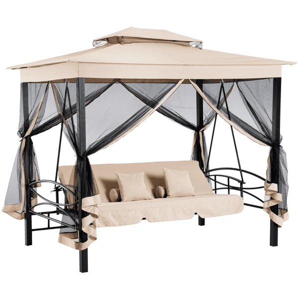 Diese Luxus-Gartenschaukel von Outsunny sorgt für ein luxuriöses Lebensgefühl. Die Gartenbank ist großzügig gepolstert und zusätzliche Kissen sorgen für viel Gemütlichkeit. Durch einen einfachen Handgriff kann die Liegefunktion aktiviert werden. Die stabile Metallkonstruktion ermöglicht ein sicheres und sanftes Schaukeln. Zusätzliche Seitenwände schützen sie vor unliebsamen Insekten. Genießen sie entspannte und gesellige Sommertage auf dieser luxuriösen Gartenschaukel von Outsunny.