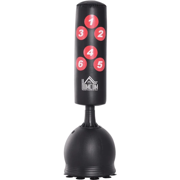 Mit Ihrem wertigen Standboxsack trainieren Sie zielgerichtet und erfolgreich von Zuhause aus. Für sicheren Stand sorgt der massive Kunststofffuß, der sich wahlweise mit Wasser oder feinem Sand befüllen lässt. Die unterseitigen angebrachten Saugnäpfe sorgen für noch mehr Halt. Die Schlagoberfläche ist strapazierfähig und gepolstert. Dank des FLEX-Systems federt Ihr Boxsack Kicks und Schläge verletzungssicher ab. Die Nummerierung der Oberfläche lässt Sie zudem Haken, Schläge und Kicks zielgenau trainieren. Aufbau und Befüllung gelingen angenehm einfach und schnell, so können Anfänger und Fortgeschrittene Ihr Boxtraining direkt in Angriff nehmen.