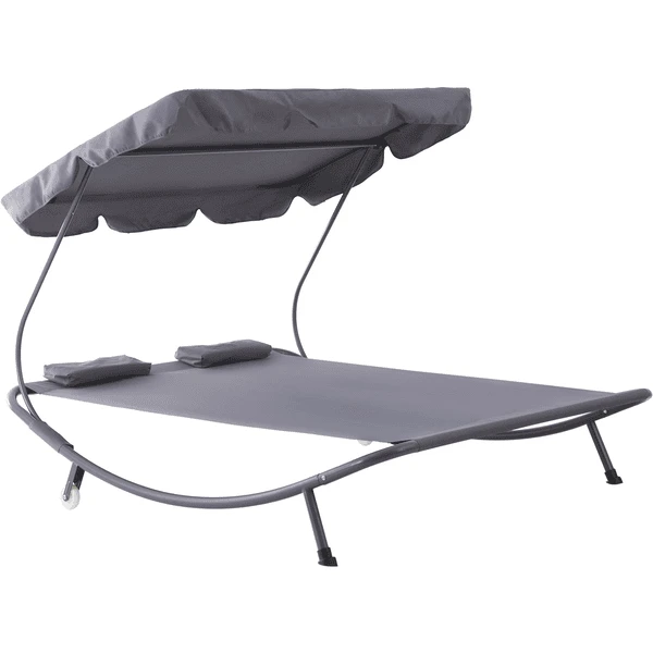 Begrüßen Sie den Sommer mit Ihrer modernen Doppelliege. Die erstklassige Relaxliege macht sich perfekt im Garten, auf dem Balkon oder am Pool. Das rund geformte Untergestell ist aus pulverbeschichteten Stahlrohren gefertigt. Damit ist es witterungsbeständig und standfest. Damit Sie Ihre Sonnenliege leicht verrücken können sind am Kopfende zwei Rollen angebracht. So finden Sie immer ein neues schattiges Plätzchen. Komfortabel liegen Sie auf dem angenehmen Oxfordbezug. Zwei mitgelieferte Kopfkissen sorgen dabei für zusätzlichen Komfort. Überdacht wird Ihre Doppelliege durch ein Sonnendach, das im Neigungswinkel flexibel verstellbar ist. So sind Sie stets vor starken Sonneneinstrahlungen geschützt. Damit Sie die warme Jahreszeit perfekt genießen können.