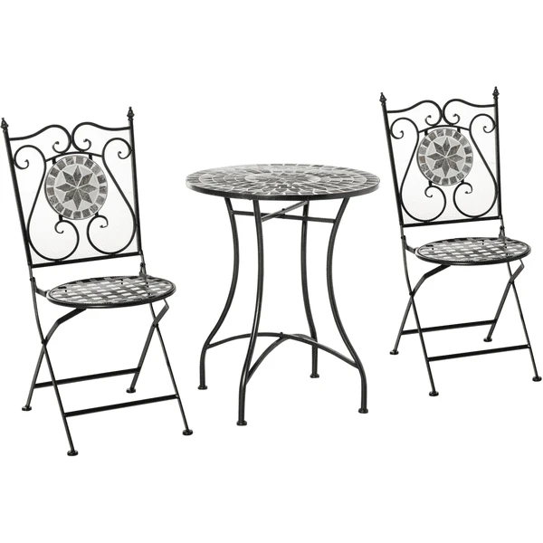 Bringen Sie Schönheit in Ihren Alltag mit diesem dreiteiligen Bistro-Set. Es besteht aus einem runden Tisch mit einer Arbeitsplatte aus Keramikmosaikfliesen und zwei Stühlen. Die Stühle haben auch Mosaik-Rückenlehnen und bieten Platz zum Entspannen mit jemandem im Freien. Die Gestelle aus Metall bilden eine solide und robuste Kernstruktur, wobei die Schnörkel an den Stühlen dem Design zusätzliche Eleganz verleihen.