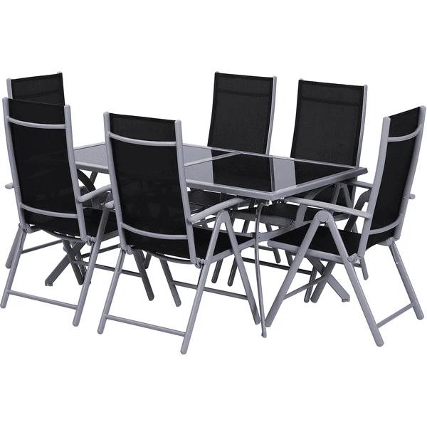 Die 7-teilige Sitzgarnitur zeichnet sich durch vielseitige und flexible Einsatzmöglichkeiten aus! Das Gartenmöbelset besteht aus Aluminium, wobei die Sitze und Lehnen der Stühle aus UV-beständigem Textilene-Stoff hergestellt sind. Das Set besteht aus einem Tisch mit edler Tischplatte aus echtem Sicherheitsglas, der 6 Personen Platz zum Ausruhen bietet und flexibel aufgestellt werden kann. Des Weiteren beinhaltet die Gartengarnitur 6 Stühle, deren Rückenlehnen verstellbar sind und somit ein angenehmes Sitz- und Liegevergnügen bereiten werden. Die schicke Sitzgruppe sorgt für ein stilvolles Ambiente und kann jederzeit platzsparend verstaut werden – Hieran werden Sie lange Freude haben und schöne Feste feiern können!