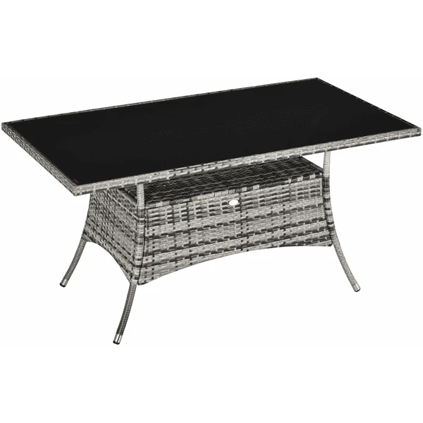 Dieser aus Poly-Rattan gefertigte Gartentisch ist sehr wetterbeständig und eignet sich ideal für den Einsatz im Freien, z.B. im Garten oder auf der Terrasse. Die Tischplatte besteht aus stabilem Sicherheitsglas und die Stützbeine sind aus massivem Metall, was den Tisch sehr stabil und tragfähig macht. Ein kleines Regal in der Mitte unter der Sicherheitsglasplatte bietet zusätzlichen Stauraum für Zeitschriften, Bücher oder andere Gegenstände. Unser Gartentisch verfügt über viel Stauraum und ist so bequem bemessen, dass er viel Platz zum Sitzen, Essen und Trinken bietet.