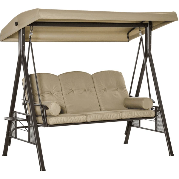 Auf der Terrasse frühstücken, die Sonne genießen, mit Freunden und Familie an der frischen Luft sitzen: Mit unserer Hollywoodschaukel sitzen Sie bequem in jeder Situation. Bis zu drei Personen finden auf diesem Möbelstück in eleganter beige-brauner Farbkombination Platz. Spürbar bequem sitzen Sie auf der 8 cm dicken Polsterung. An beiden Seiten ist eine kompakte Ablage angebracht, auf der Snacks, kühle Getränke und ein gutes Buch sicher Platz finden. Das UV-beständige Sonnendach schützt Sie vor intensiver Sonneneinstrahlung und leichtem Regen. Mit dem Gestell aus pulverbeschichtetem Metall können Sie Ihre Gartenschaukel unbedacht im Freien einsetzen: Das robuste Material trotzt der Witterung und besticht durch seine hohe Stabilität. Holen Sie sich ein Stück Urlaubsatmosphäre in Ihren Garten!