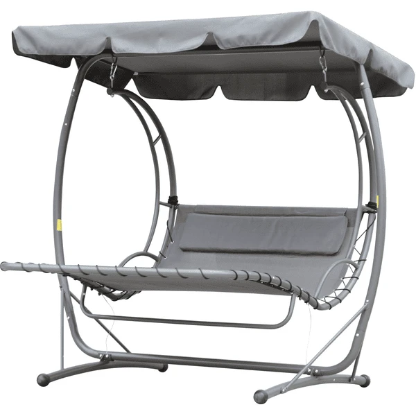 Diese Schwebeliege mit Dach ist dank des schönen, modernen Designs ein absolutes Highlight in jedem Garten, auf jeder Terrasse oder auf dem Balkon. Sie ist in einem neuen Design gehalten, sodass die Hängeliege mit Dach ebenfalls als Hollywoodschaukel bezeichnet werden kann. Dank der robusten und guten Verarbeitung bietet die Schwebeliege für bis zu 2 Personen Platz. Das in der Neigung verstellbare Dach sorgt dafür, dass Sie vor blendenden Sonnenstrahlen geschützt sind. Der atmungsaktive Textilene Stoff der Liege und das mitgelieferte Kopfkissen vervollständigt, aufgrund einer leichten Luftzirkulation, Ihre Momente der Entspannung und verwandelt die Schwebeliege mit Dach in einen perfekten und idyllischen Ort zum Ausruhen.