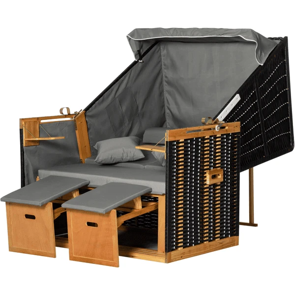 Schick und gemütlich zugleich: Der Strandkorb für zwei Personen ist ein echter Hingucker. Er macht sich ebenso gut auf der Terrasse wie im Garten und bietet Ihnen alles, was Sie von Strandkörben im Urlaub kennen: zwei praktische Klapptische, ausziehbare Fußstützen, ein Sonnendach zum Herunterklappen und die mehrstufig verstellbare Rückenlehne. Unser Plus: praktische Taschen an den Innenseiten, in denen Sie zum Beispiel Zeitschriften aufbewahren können. Damit holen Sie sich echtes Strand- und Urlaubs-Feeling ganz einfach nach Hause.