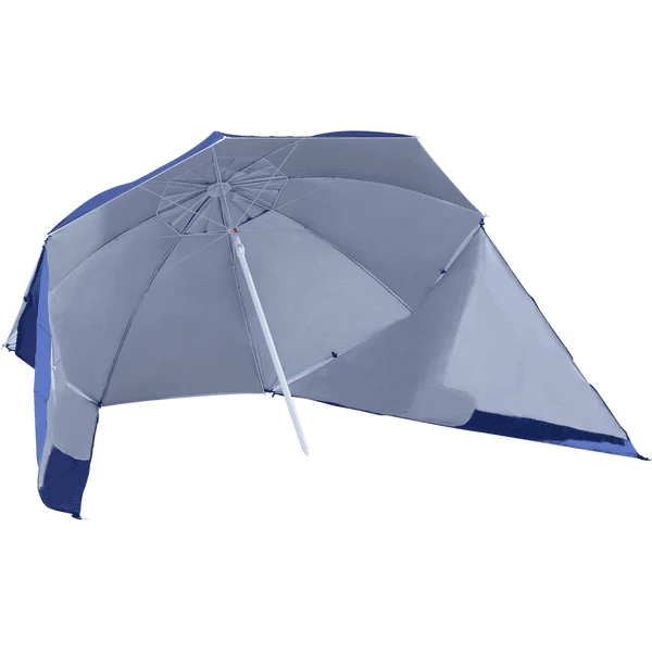 Für alle, die Meer wollen, gibt es unseren blauen 2 in 1 Sonnenschirm. Für den heimischen Gebrauch ist er der perfekte Schattenspender. Dabei macht er eine gute Figur im Garten, auf der Terrasse oder Ihrem Balkon. Für den Urlaub lässt sich Ihr Schirm kompakt in der mitgelieferten Transporttasche verstauen. Am Strand bringen Sie im Handumdrehen die praktischen Seitenteile an und verwandeln Ihren Schirm in eine Strandmuschel. Dank wasserabweisendem PVC und UV-beständiger Silberbeschichtung sind Sie und Ihre Familie dabei bestens geschützt. So kann der Sommer kommen.